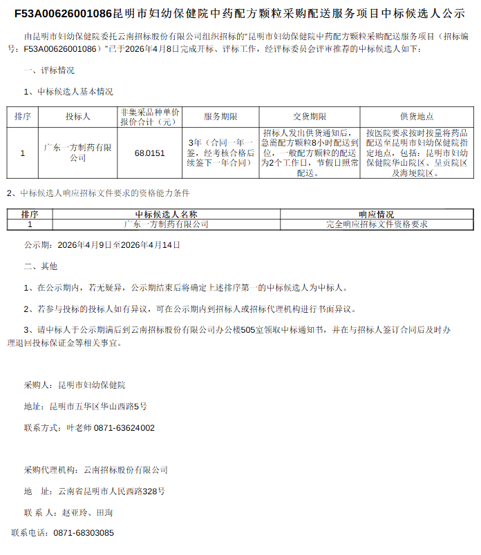 云南省昆明市妇幼保健院中药配方颗粒采购配送服务项目中标候选人公示