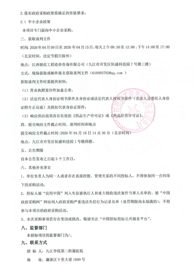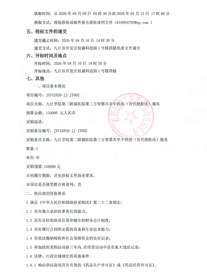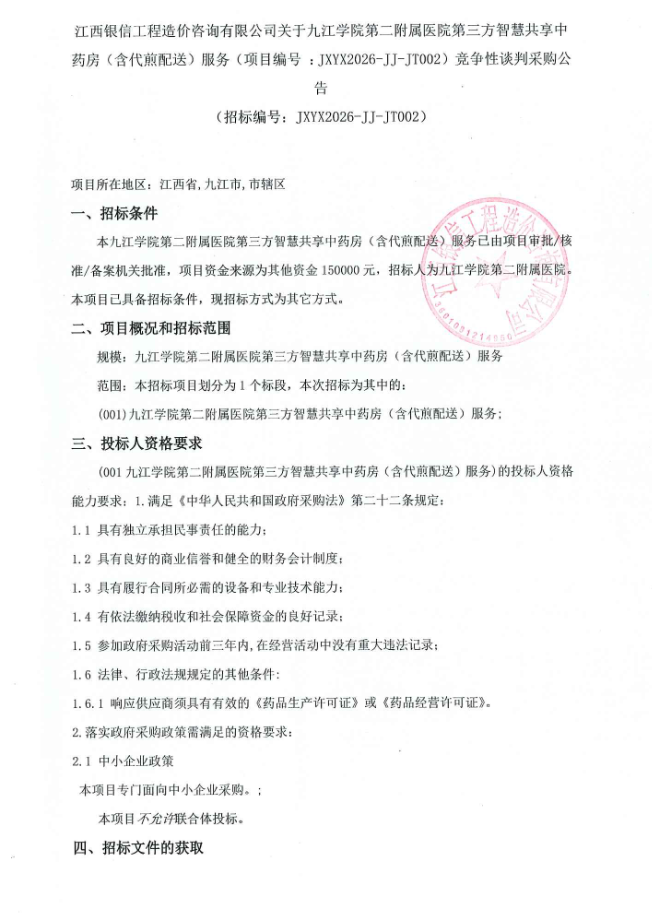 江西银信工程造价咨询有限公司关于九江学院第二附属医院第三方智慧共享中药房(含代煎配送)服务(项目编号 :JXYX2026-JJ-JT002)竞争性谈判采购公告
