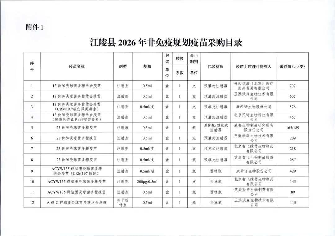 为贯彻落实《中华人民共和国疫苗管理法》,进一步规范全县非免疫规划疫苗采购管理,满足各级预防接种单位和我县群众需求,同时做好廉政风险防范,加强监督管理,县疾控中心于2026年3月17日组织召开了江陵县2026年非免疫规划疫苗、生物制品使用目录遴选会议。经江陵县非免疫规划疫苗遴选委员会9位成员现场遴选,遴选出99个品规的非免疫规划及生物制品,形成《江陵县2026年非免疫规划疫苗使用目录》《江陵县2026年生物制品采购目录》。现予以公示