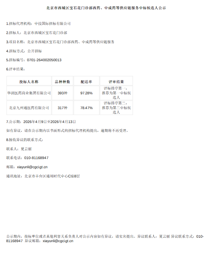 北京市西城区宝石花门诊部西药、中成药等供应链服务中标候选人公示