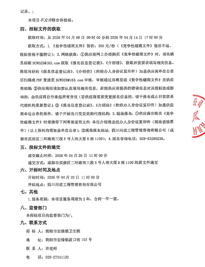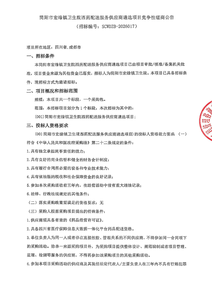 四川省简阳市宏缘镇卫生院西药配送服务供应商遴选项目竞争性磋商公告