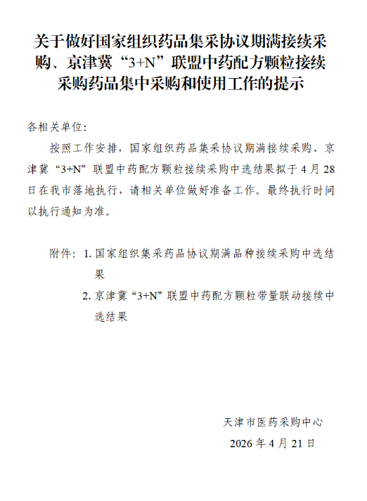 【天津】关于做好国家组织药品集采协议期满接续采购、京津冀“3+N”联盟中药配方颗粒接续采购药品集中采购和使用工作的提示