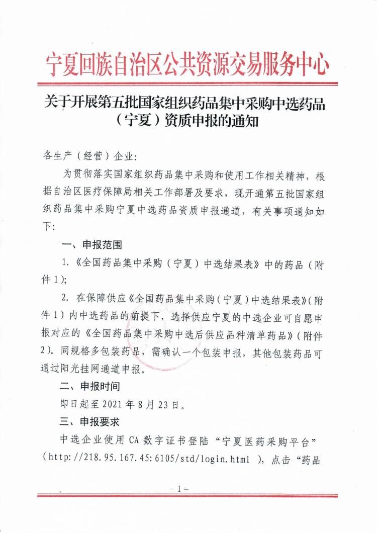 为贯彻落实国家组织药品集中采购和使用工作相关精神,根据自治区医疗保障局相关工作部署及要求,现开通第五批国家组织药品集中采购宁夏中选药品资质申报通道,有关事项通知如下: