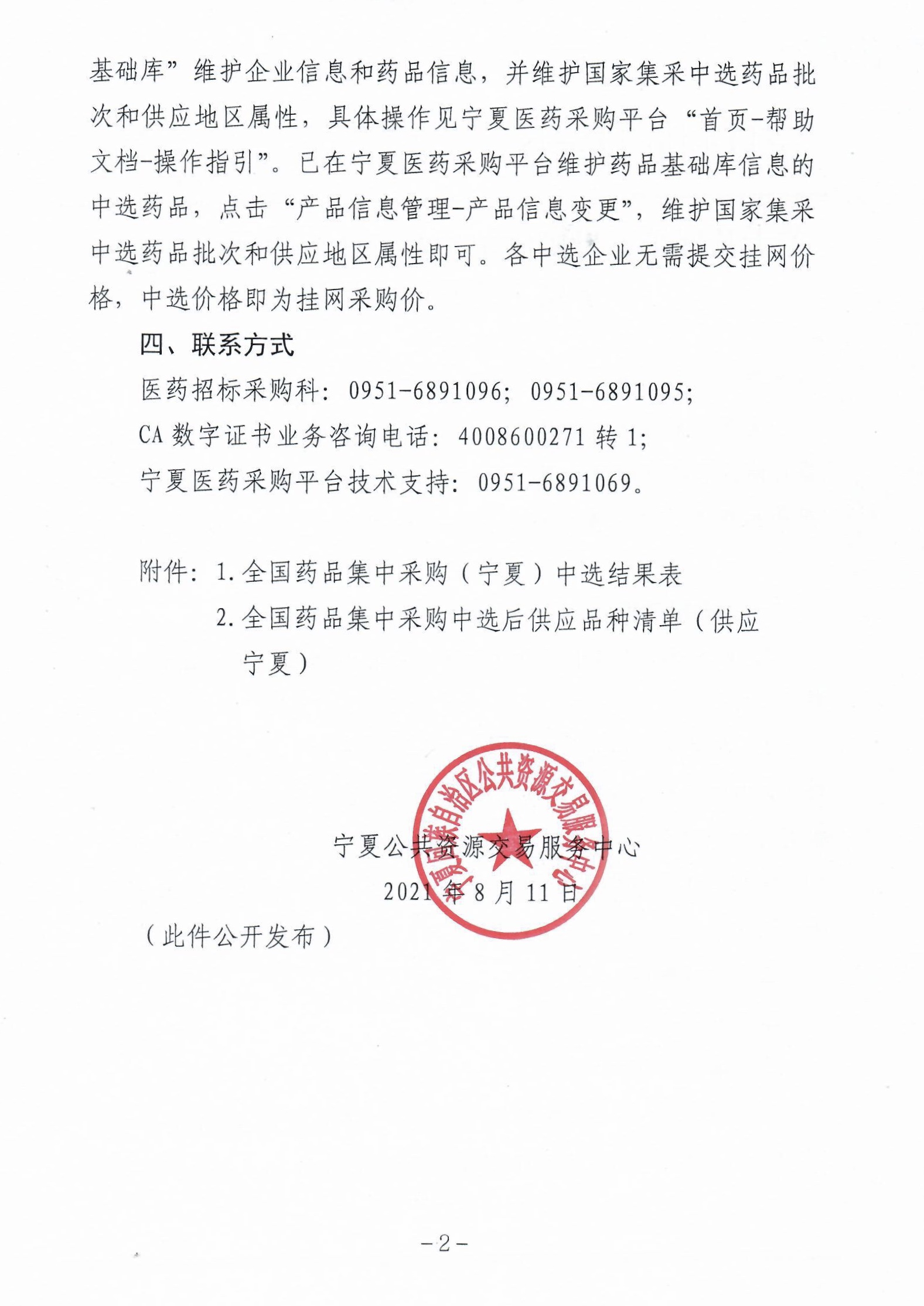 附件:1.全国药品集中采购(宁夏)中选结果表