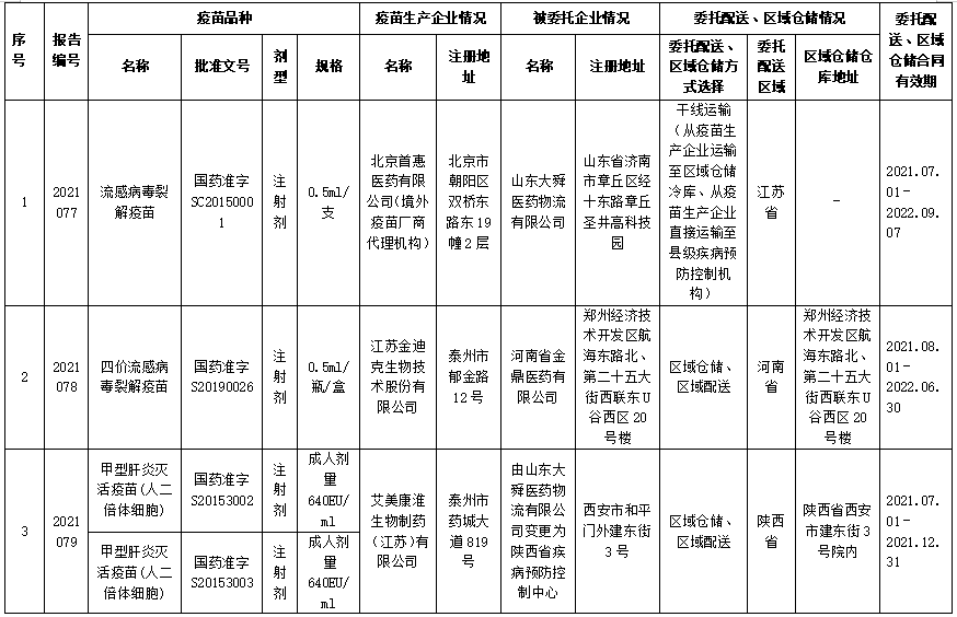 【江苏】江苏省药品监督管理局关于江苏省非免疫规划疫苗委托配送和区域仓储情况信息的公告 (2021年第14号)