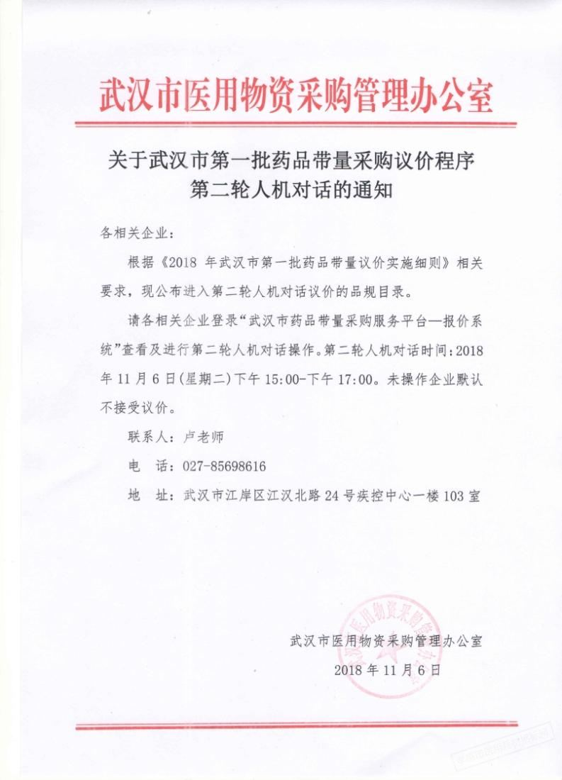 【武汉】湖北省武汉市医用物资采购管理办公室关于武汉市第一批药品带量采购议价程序第二轮人机对话的通知