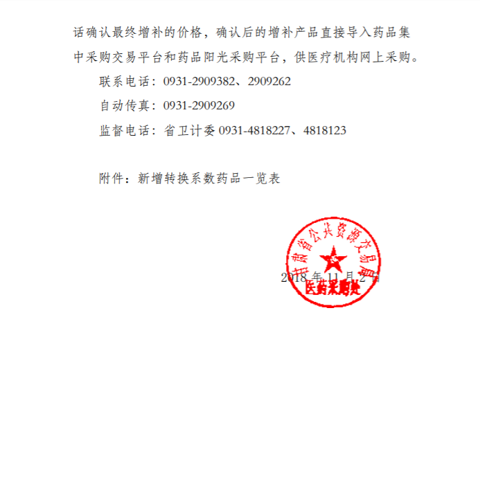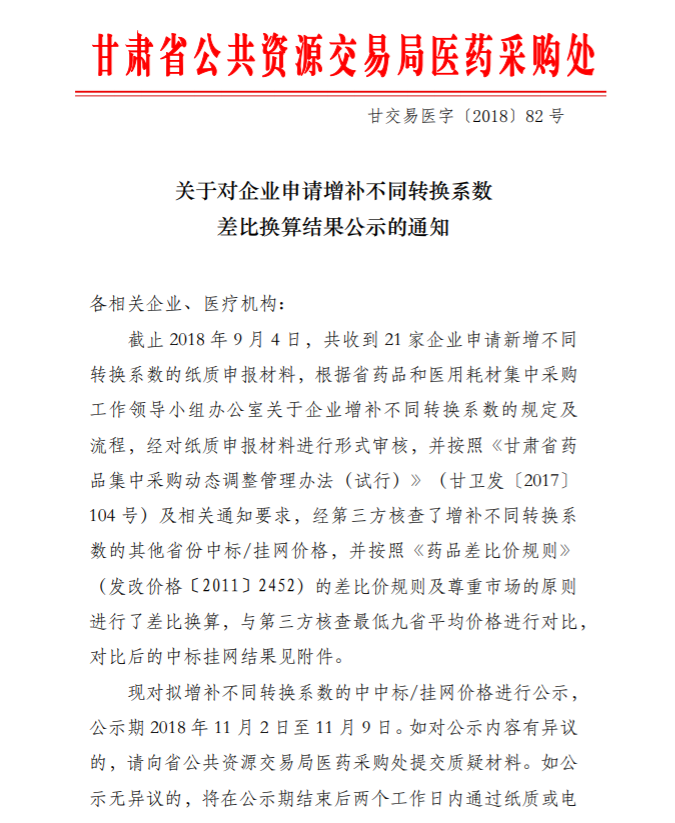 【甘肃】甘肃省关于对企业申请增补不同转换系数差比换算结果公示的通知甘交易医字〔2018〕82号
