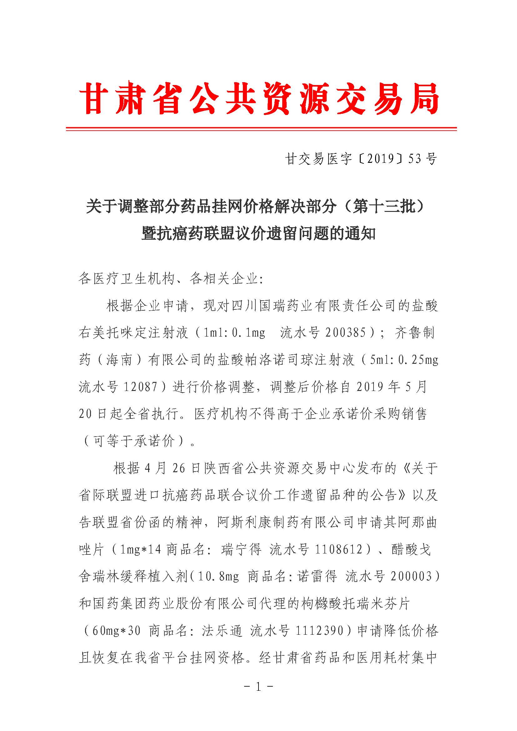【甘肃】甘肃省关于调整部分药品挂网价格解决部分(第十三批)暨抗癌药联盟议价遗留问题的通知