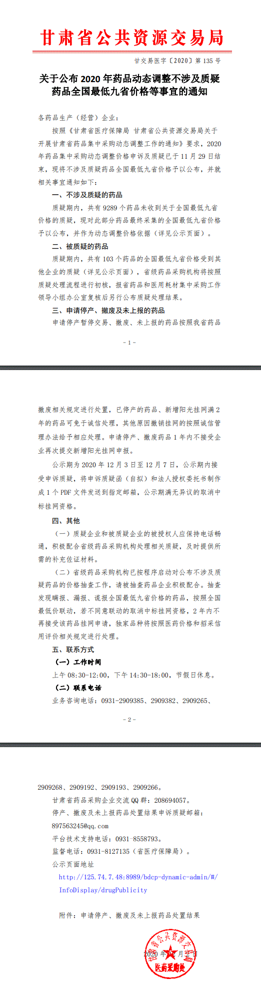 【甘肃】甘肃省关于公布2020年药品动态调整不涉及质疑药品全国最低九省价格等事宜的通知