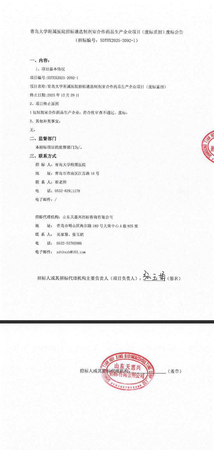 【青岛大学附属医院】山东省青岛大学附属医院招标遴选制剂室合作药品生产企业项目(废标重招)废标公告
