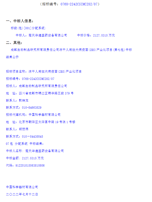【成都生物制品研究所有限责任公司】冻干人用狂犬病疫苗(2BS)产业化(第七包)中标结果公示