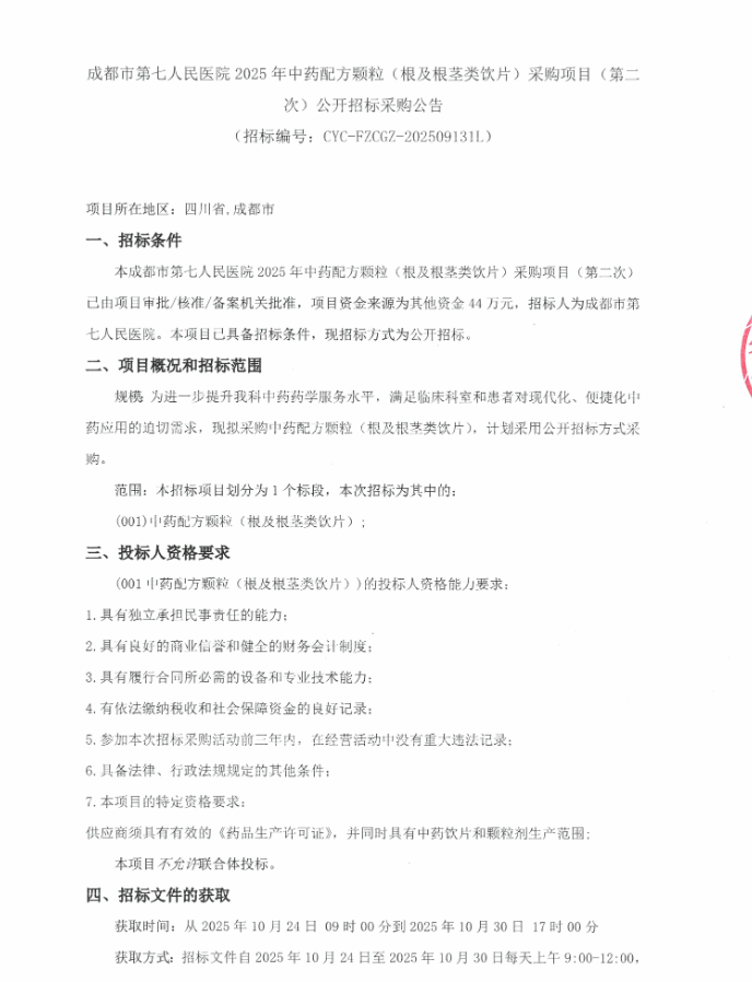【成都市第七人民医院】四川省成都市第七人民医院2025年中药配方颗粒(根及根茎类饮片)采购项目(第二次)公开招标采购公告