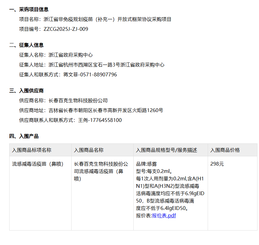 【浙江省疾病预防控制中心】长春百克生物科技股份公司入围浙江省非免疫规划疫苗(补充一)开放式框架协议采购项目的结果公告