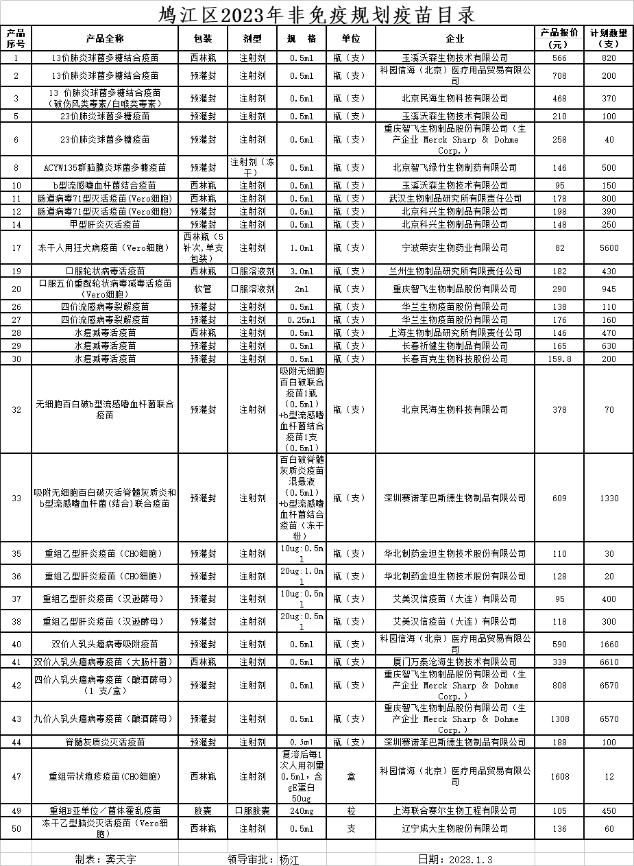 鸠江区2023年非免疫规划疫苗目录