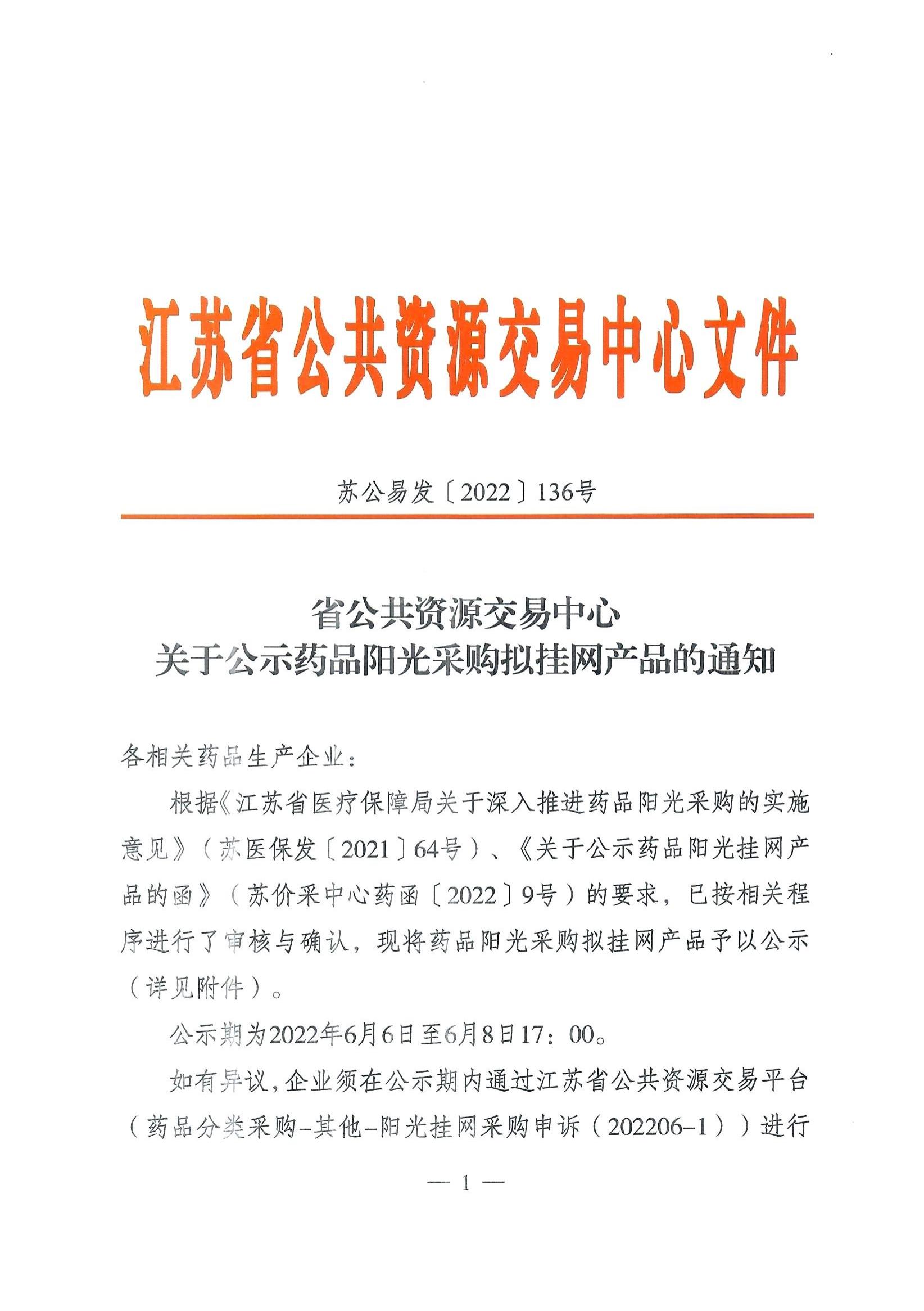 【江苏】省公共资源交易中心关于公示药品阳光采购拟挂网产品的通知(20220606)