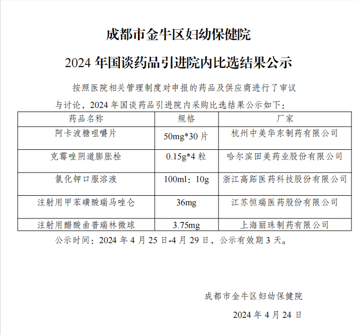 【成都市金牛区妇幼保健院】四川省成都市金牛区妇幼保健院2024年国谈药品引进院内比选结果公示