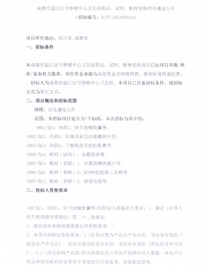 【成都市温江区万春镇中心】四川省成都市温江区万春镇中心卫生院药品、试剂、耗材采购项目遴选公告