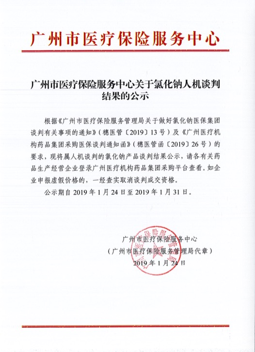 【广州】广东省广州市医疗保险服务中心关于氯化钠人机谈判结果的公示