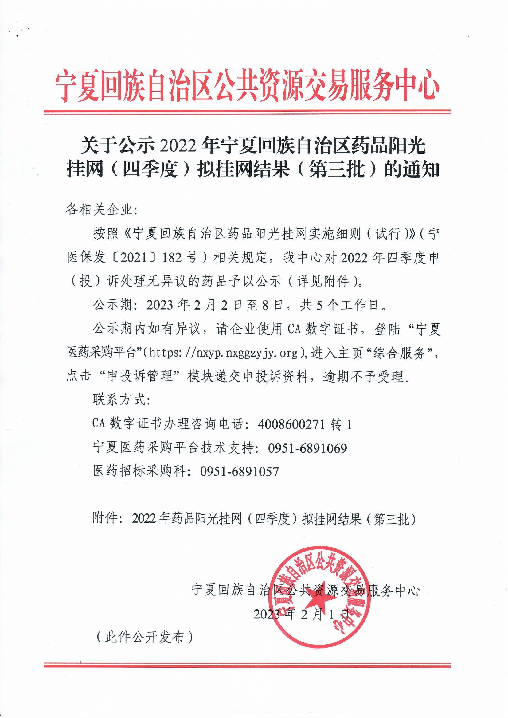按照《宁夏回族自治区药品阳光挂网实施细则(试行)》(宁医保发〔2021〕182号)相关规定,我中心对2022年四季度申(投)诉处理无异议的药品予以公示(详见附件)。