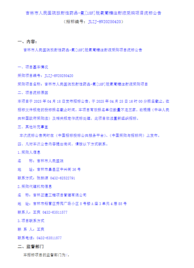 【吉林市人民医院】吉林省吉林市人民医院放射性药品-氟〔18F〕脱氧葡糖注射液采购项目流标公告