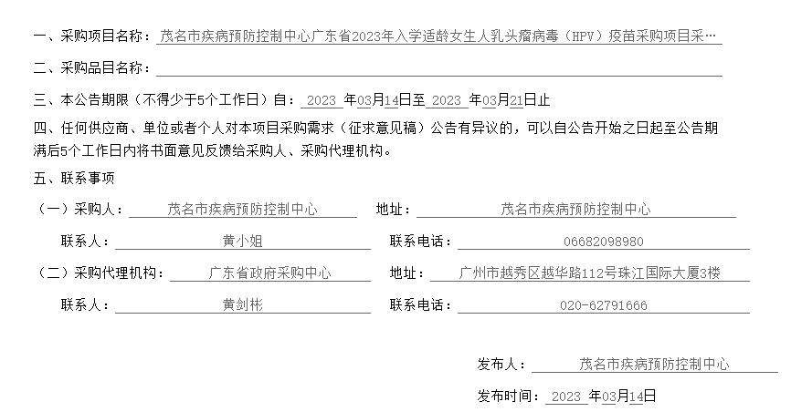 【茂名市疾病预防控制中心】广东省茂名市疾病预防控制中心广东省2023年入学适龄女生人乳头瘤病毒(HPV)疫苗采购项目采购需求征求意见公告