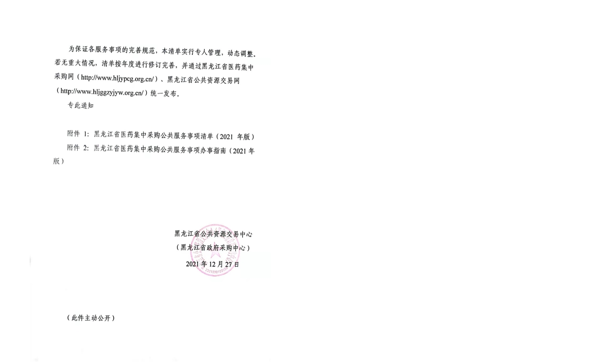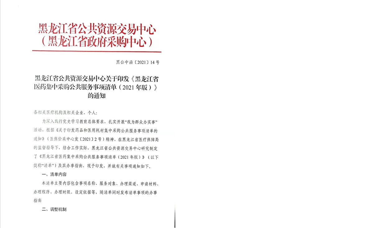 【黑龙江】黑龙江省公共资源交易中心关于印发《黑龙江省医药集中采购公共服务事项清单(2021年版)》的通知