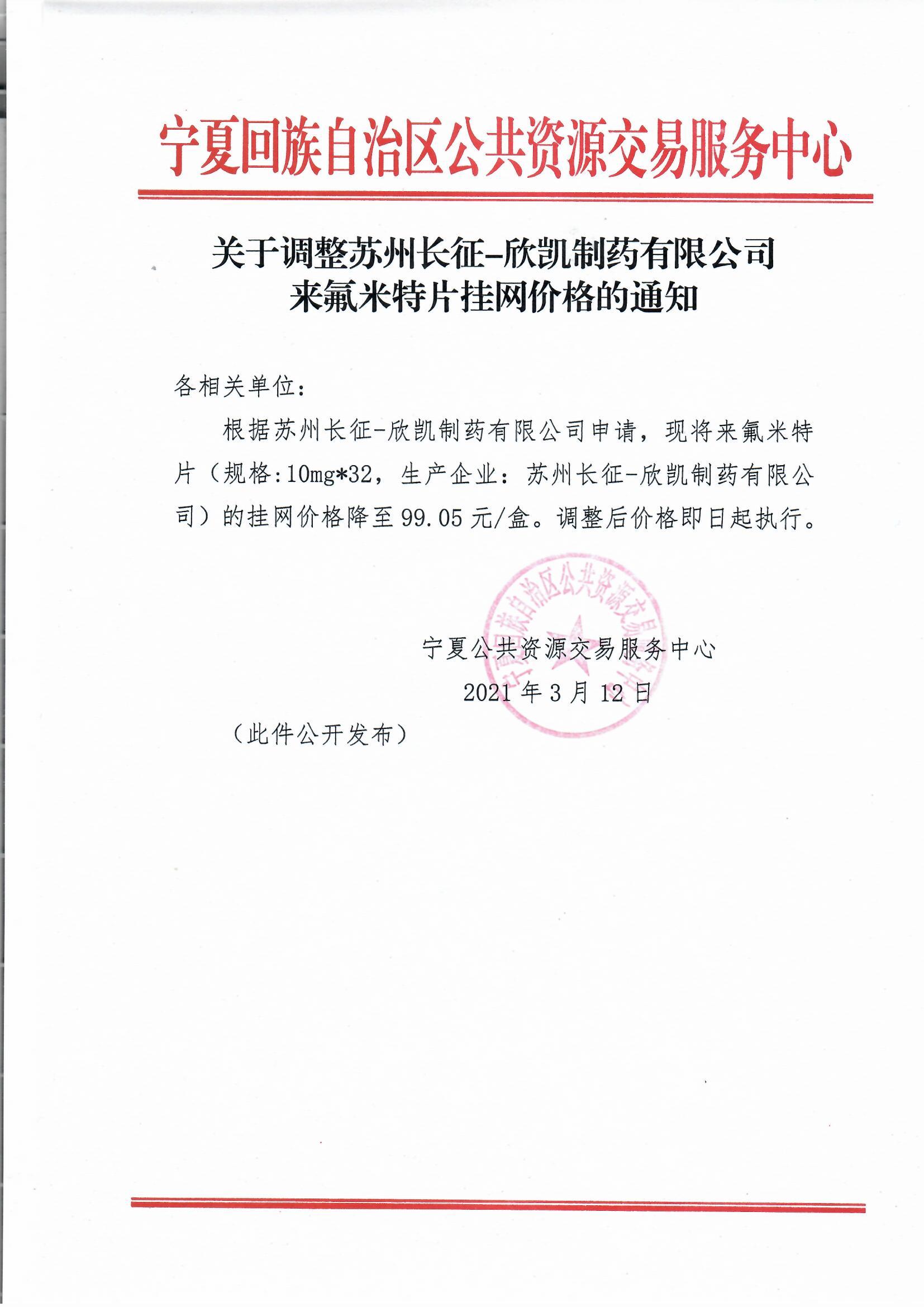 【宁夏】2021年宁夏自治区关于调整苏州长征-欣凯制药有限公司来氟米特片挂网价格的通知