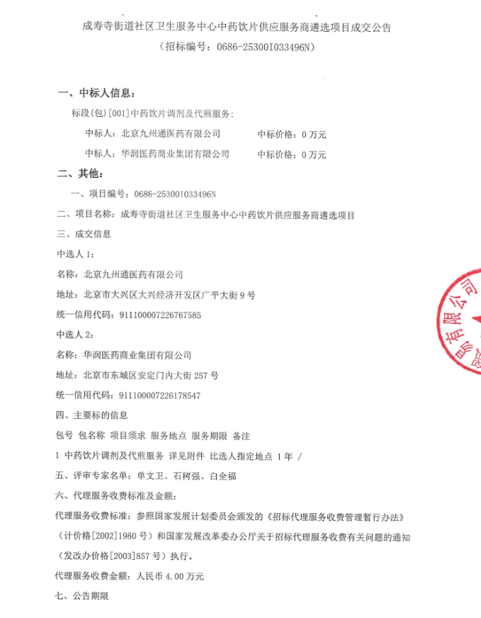 【北京市成寿寺街道社区卫生服务中心】北京市成寿寺街道社区卫生服务中心中药饮片供应服务商遴选项目成交公告