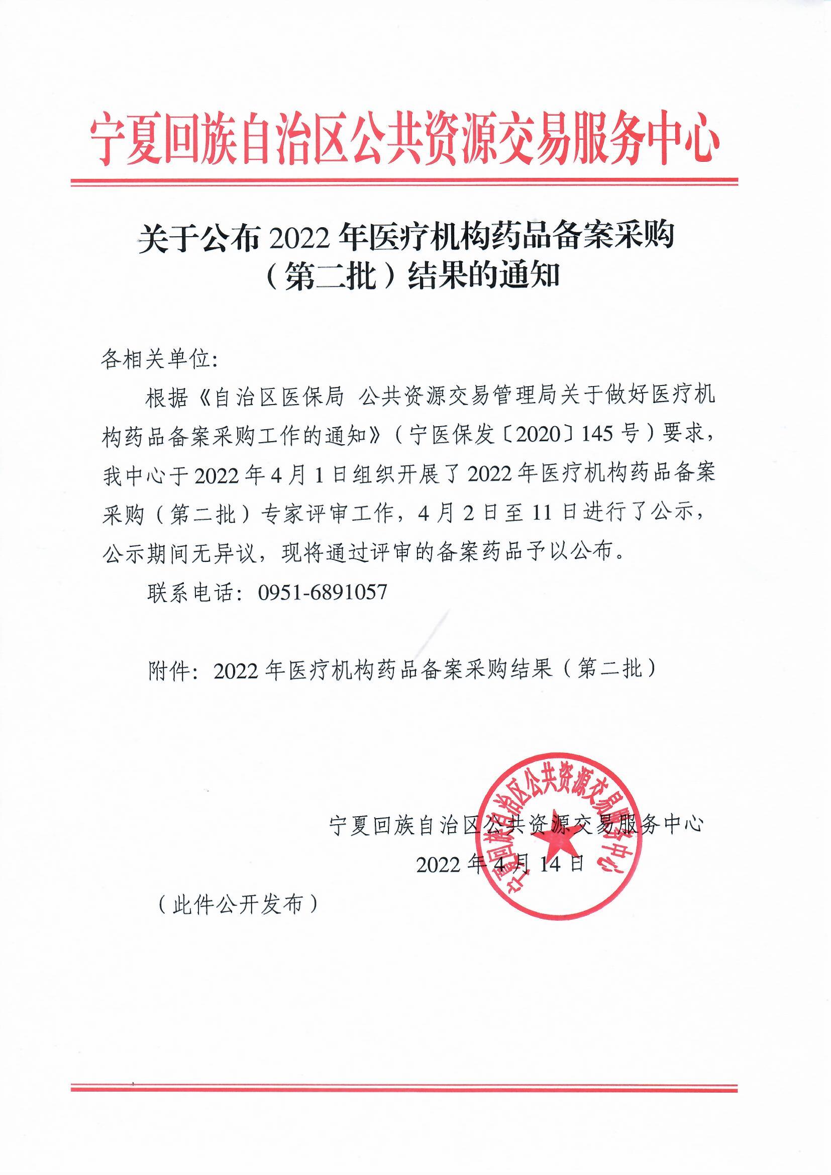 【宁夏】宁夏回族自治区关于公布2022年医疗机构药品备案采购(第二批)结果的通知