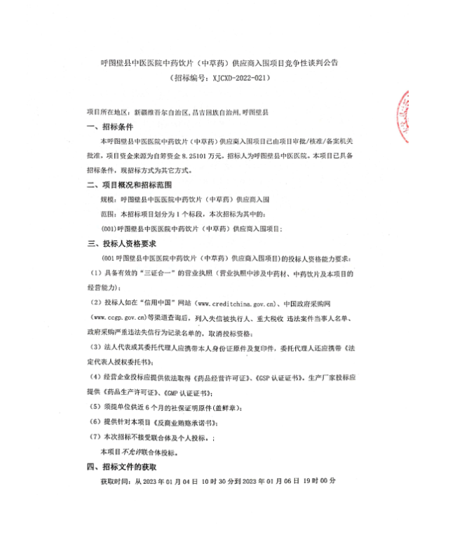 【呼图壁县中医医院】新疆维吾尔自治区昌吉回族自治州呼图壁县中医医院中药饮片(中草药)供应商入围项目竞争性谈判公告