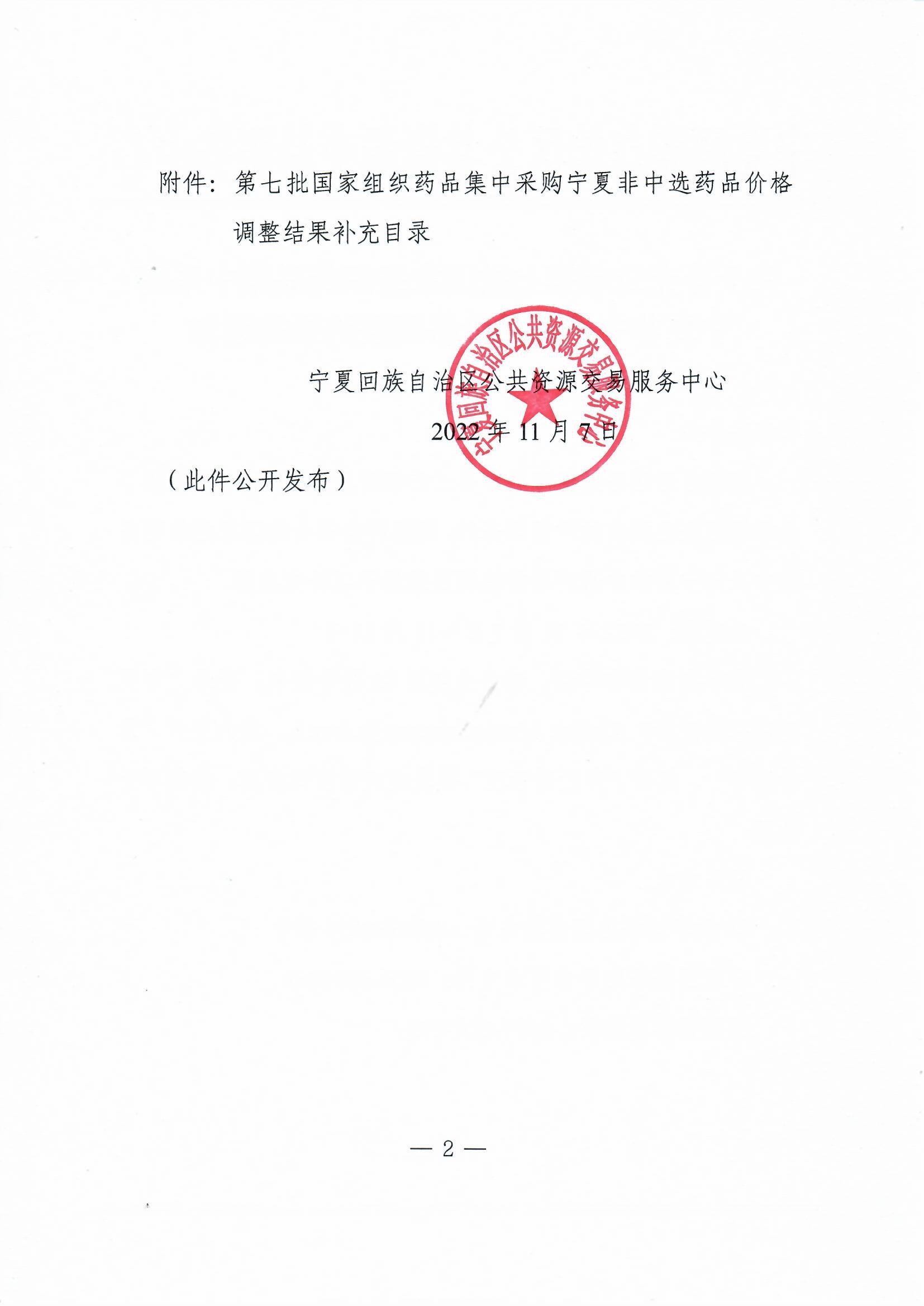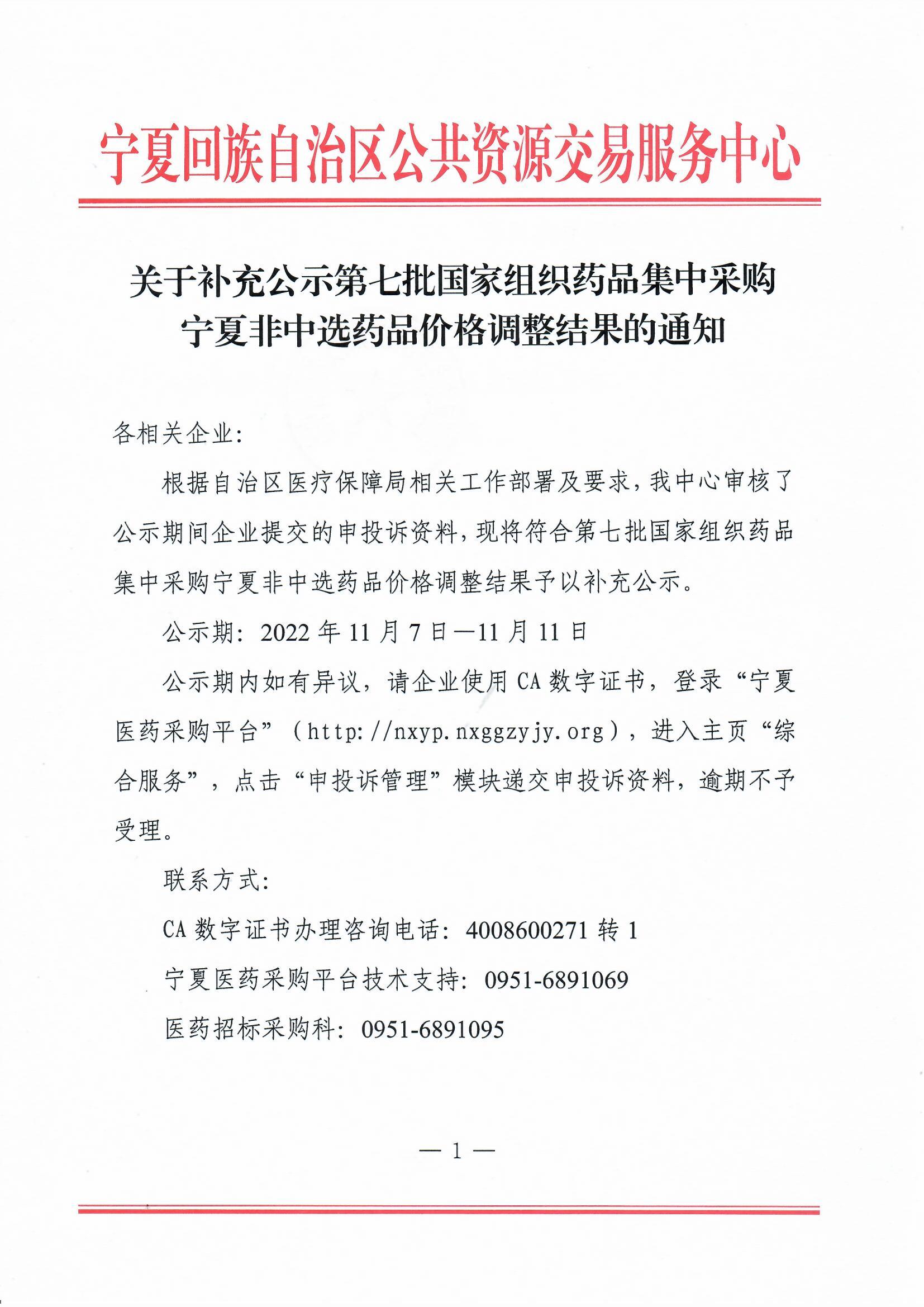 【宁夏】关于补充公示第七批国家组织药品集中采购宁夏非中选药品价格调整结果的通知