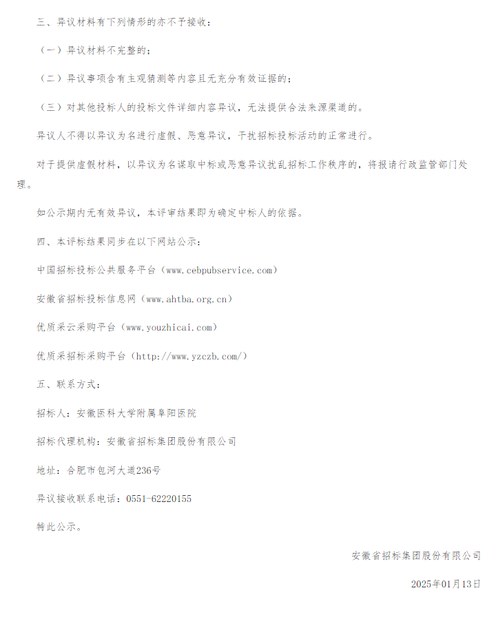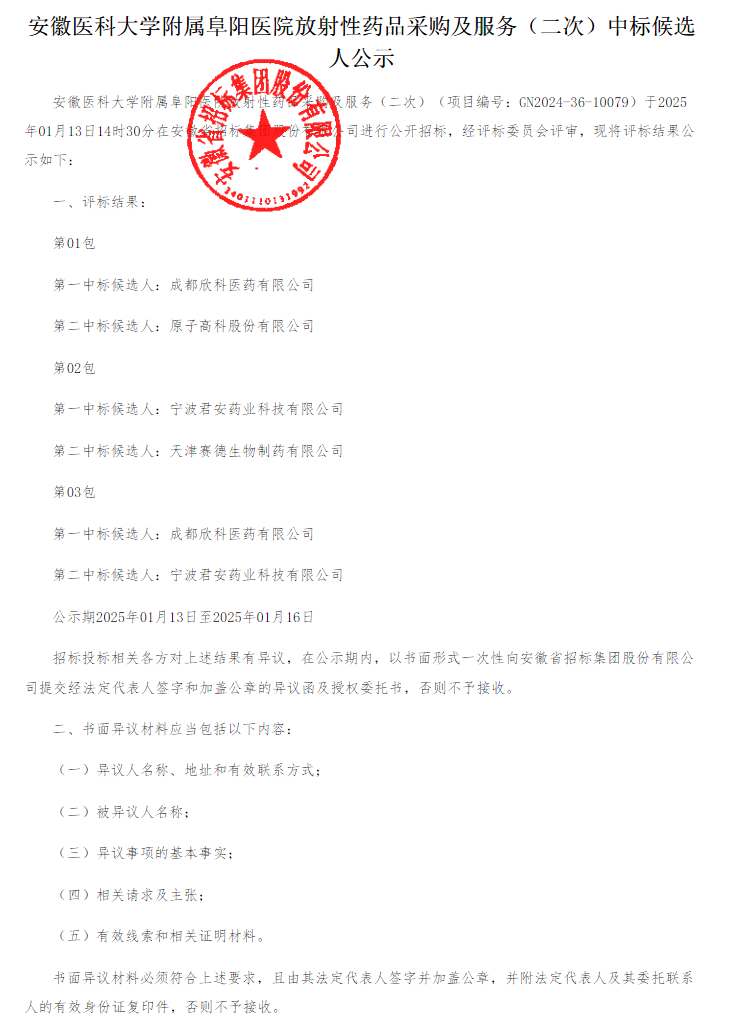 【安徽医科大学附属阜阳医院】安徽医科大学附属阜阳医院放射性药品采购及服务(二次)中标候选人公示