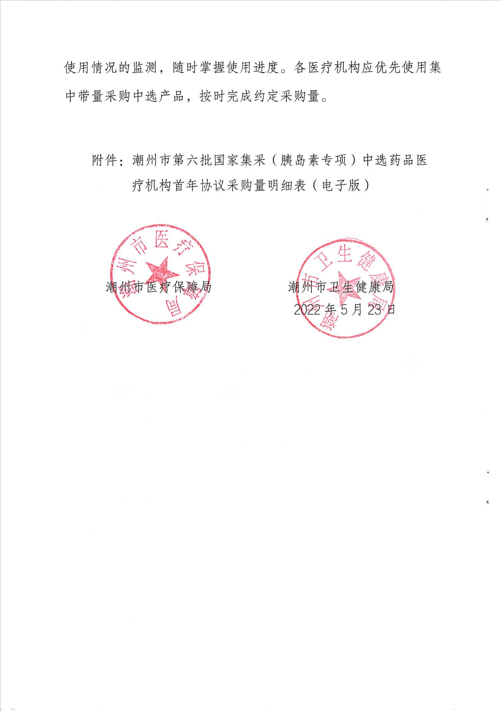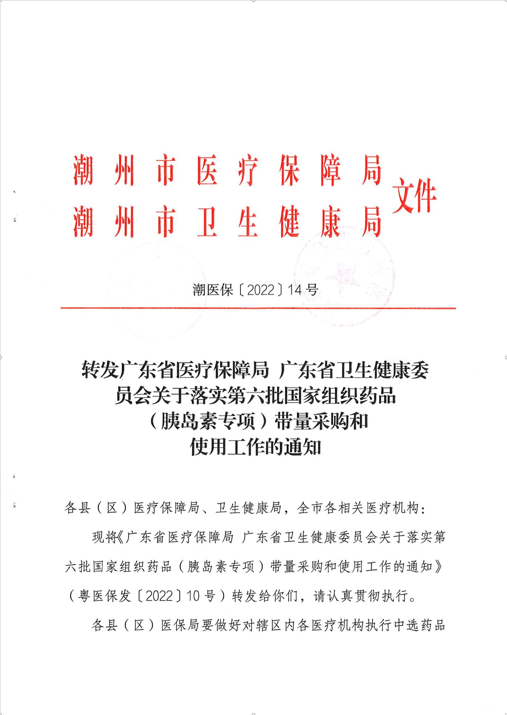 【潮州】广东省潮州市医疗保障局转发广东省医疗保障局广东省卫生健康委员会关于落实第六批国家组织药品(胰岛素专项)带量采购和使用工作的通知