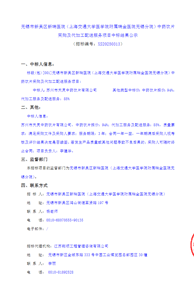 【无锡市新吴区新瑞医院】江苏省无锡市新吴区新瑞医院(上海交通大学医学院附属瑞金医院无锡分院)中药饮片采购及代加工配送服务项目中标结果公示