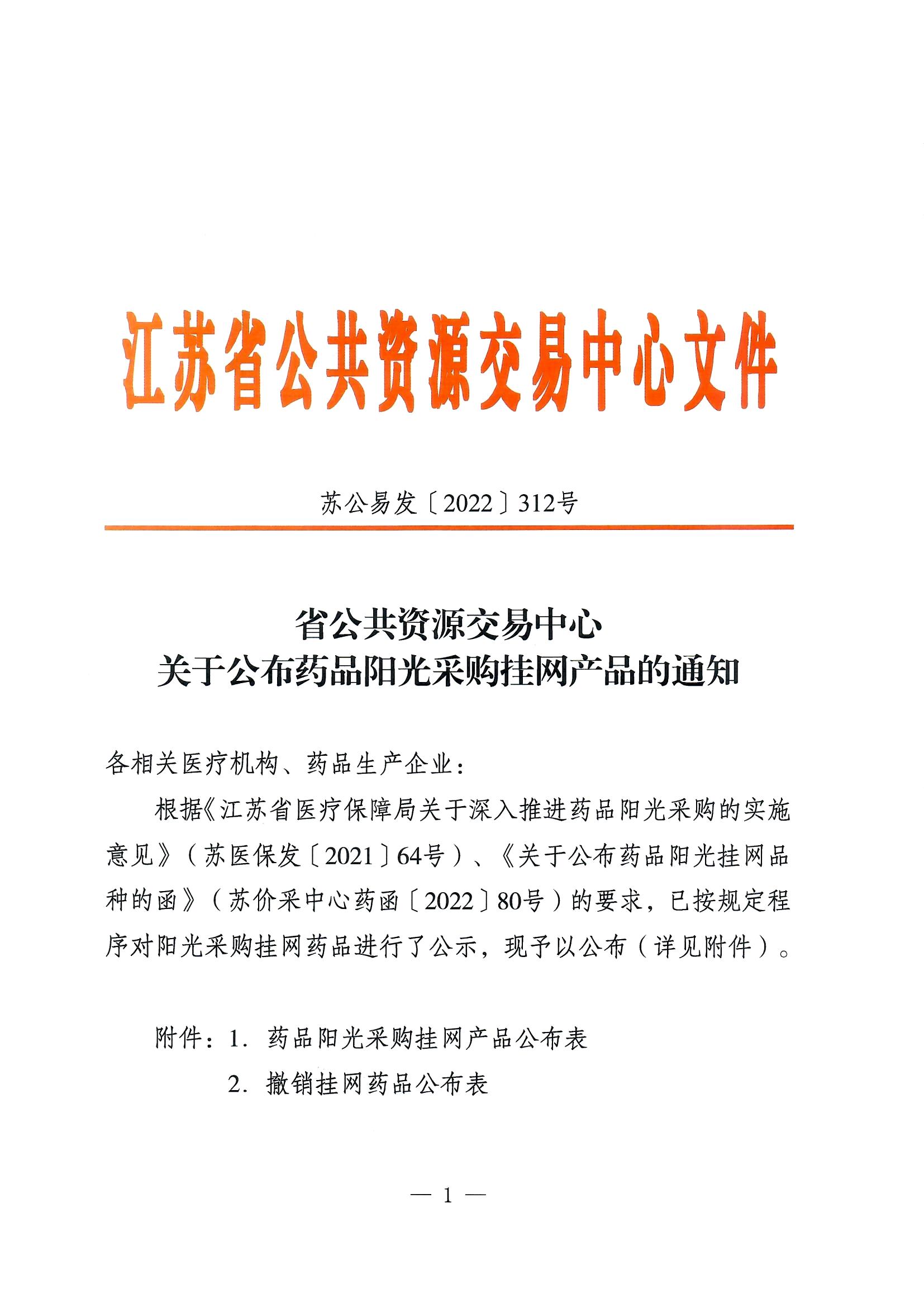根据《江苏省医疗保障局关于深入推进药品阳光采购的实施意见》(苏医保发〔2021〕64号)、《关于公布药品阳光挂网品种的函》(苏价采中心药函〔2022〕80号)的要求,已按规定程序对阳光采购挂网药品进行了公示,现予以公布(详见附件)。