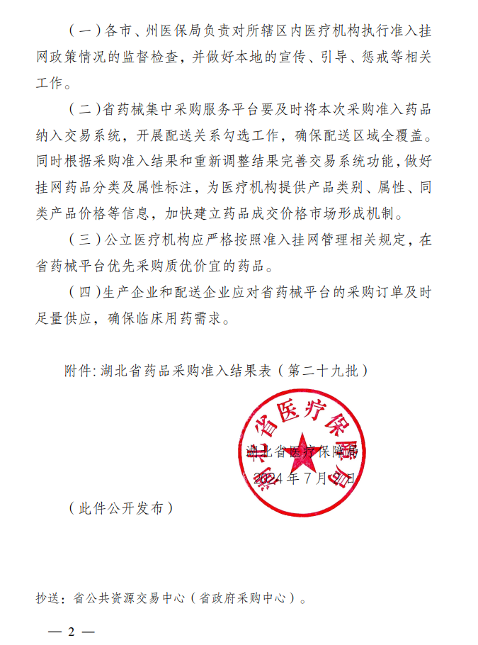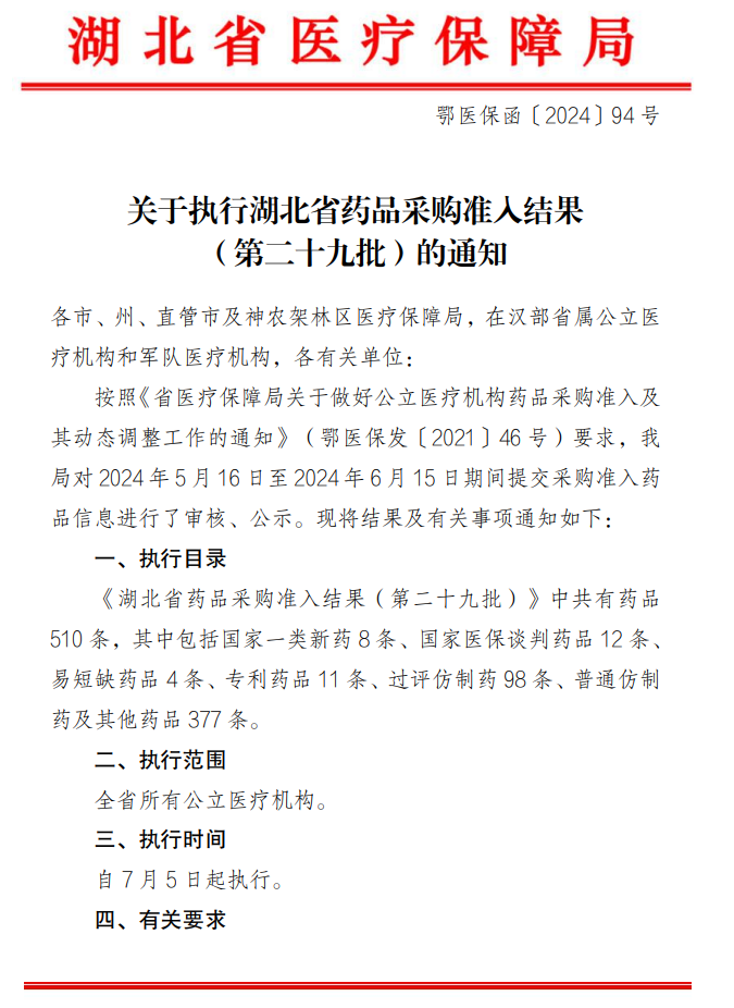 【鄂州】鄂医保函〔2024〕94号关于执行湖北省药品采购准入结果(第二十九批)的通知