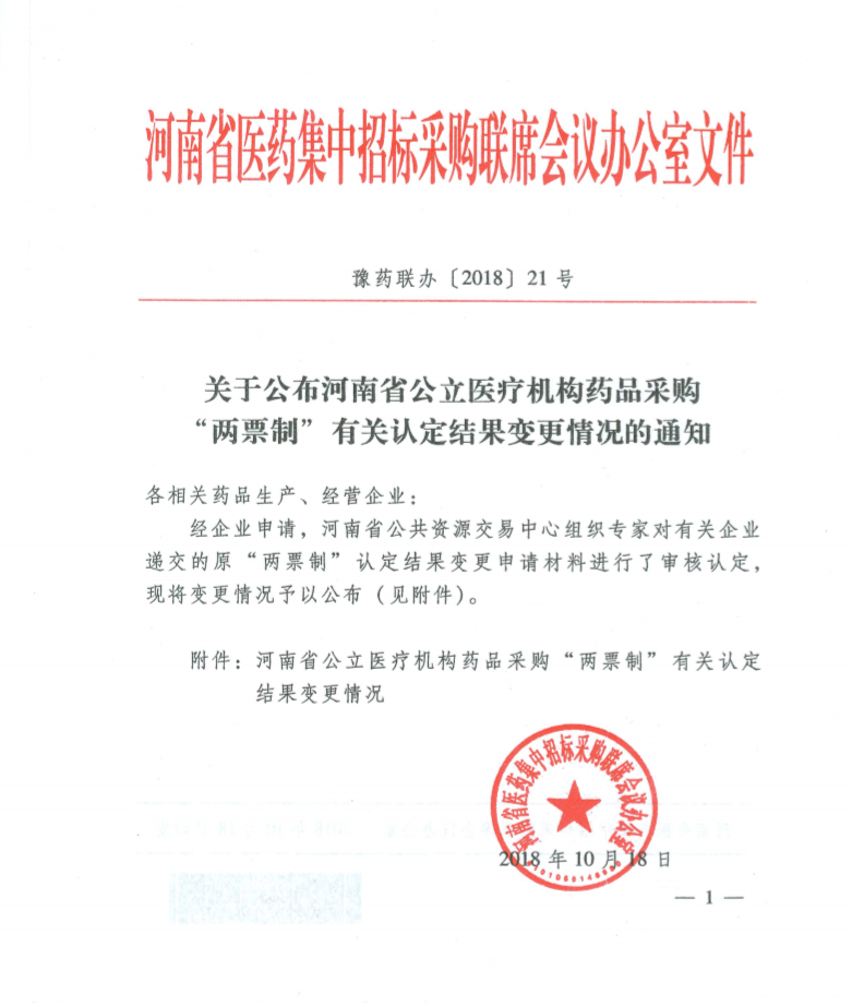 【河南】关于公布河南省公立医疗机构药品采购“两票制”有关认定结果变更情况的通知