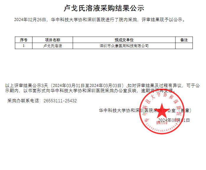 【华中科技大学协和深圳医院】广东省深圳市南山区华中科技大学协和深圳医院卢戈氏溶液成交候选人公示