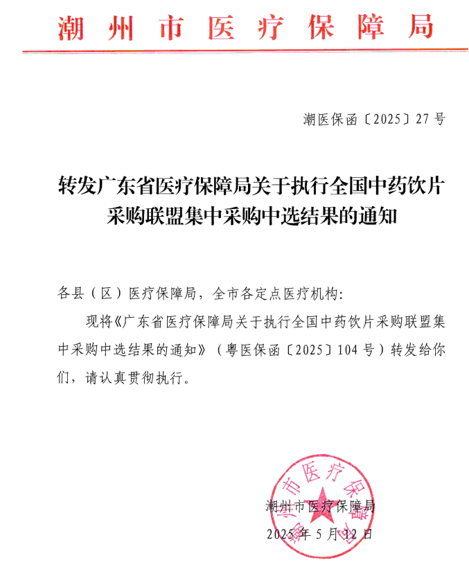 【潮州】潮医保函〔2025〕27号转发广东省医疗保障局关于执行全国中药饮片采购联盟集中采购中选结果的通知