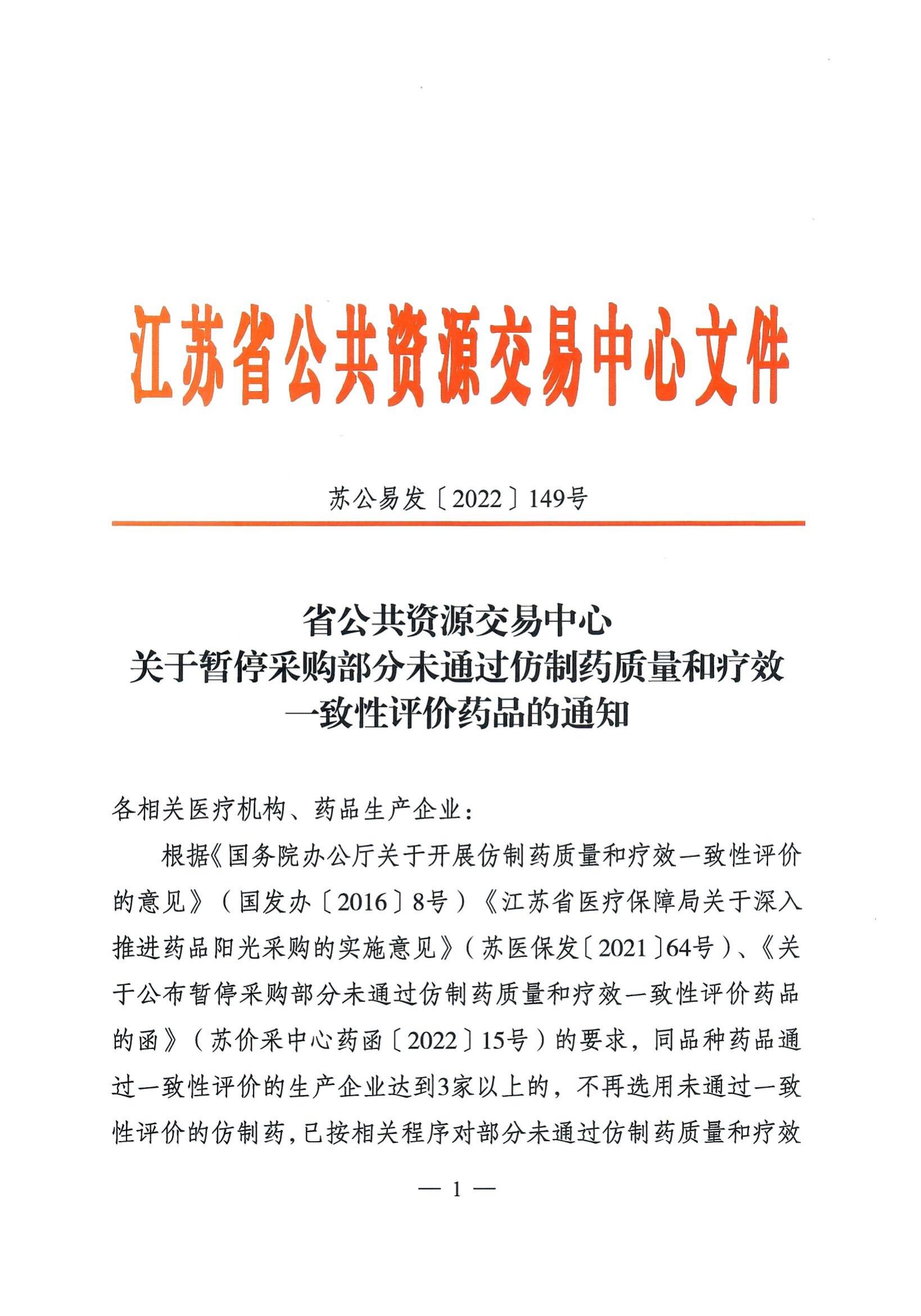 【江苏】省公共资源交易中心关于暂停采购部分未通过仿制药质量和疗效一致性评价药品的通知 苏公易发(2022)149号