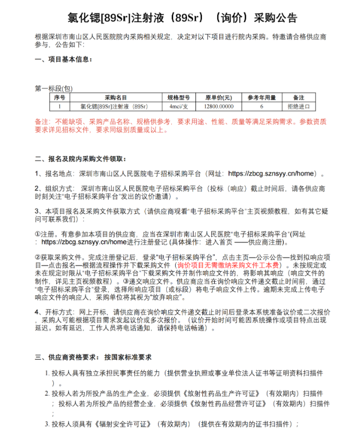 【深圳市南山区人民医院】广东省深圳市南山区人民医院氯化锶〔89Sr〕注射液(89Sr)(询价)采购公告