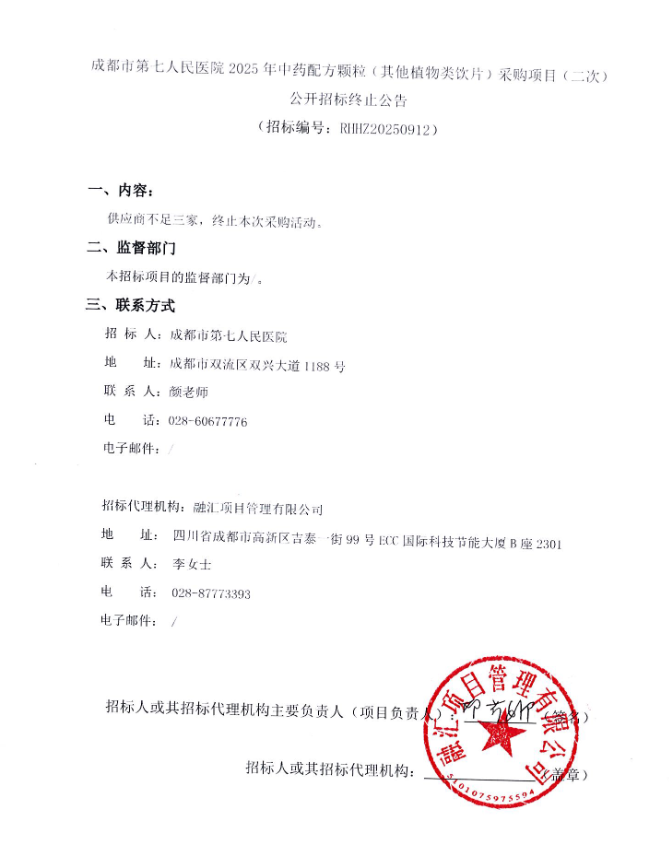 【成都市第七人民医院】四川省成都市第七人民医院2025年中药配方颗粒(其他植物类饮片)采购项目(二次)公开招标终止公告