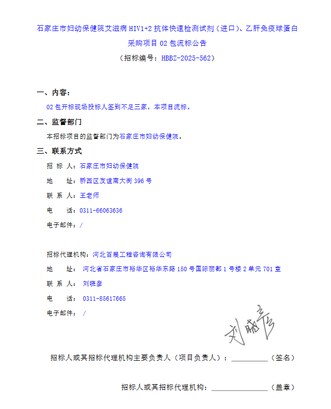 【石家庄市妇幼保健院】河北省石家庄市妇幼保健院艾滋病HIV1+2抗体快速检测试剂(进口)、乙肝免疫球蛋白采购项目02包流标公告