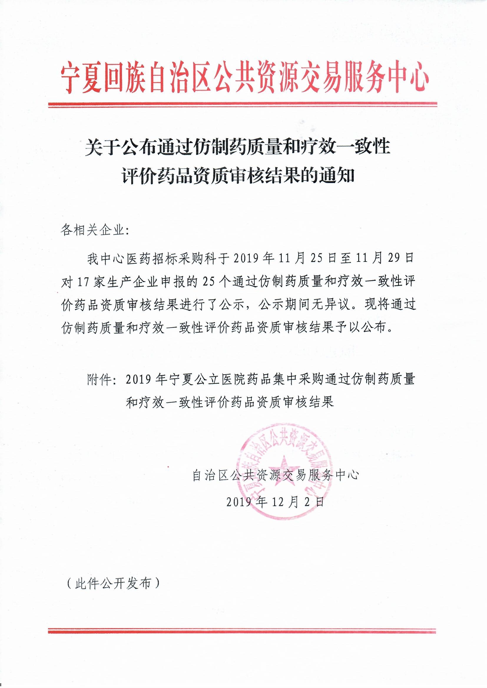 【宁夏回族自治区】宁夏回族自治区关于公布通过仿制药质量和疗效一致性评价药品资质审核结果的通知(20191202)