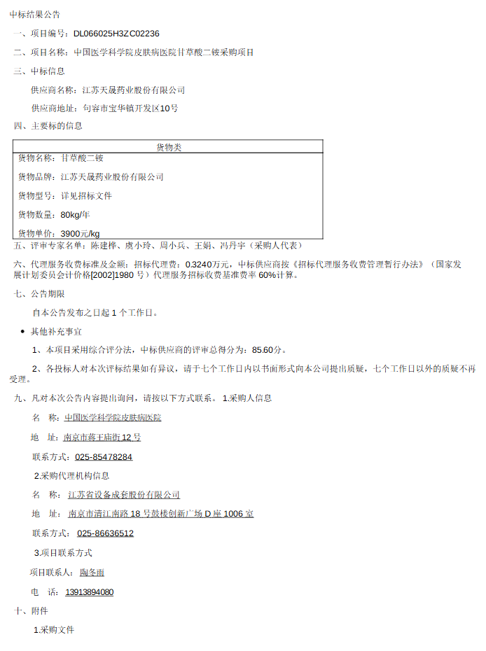 【中国医学科学院皮肤病医院】江苏省中国医学科学院皮肤病医院甘草酸二铵采购项目中标结果公告