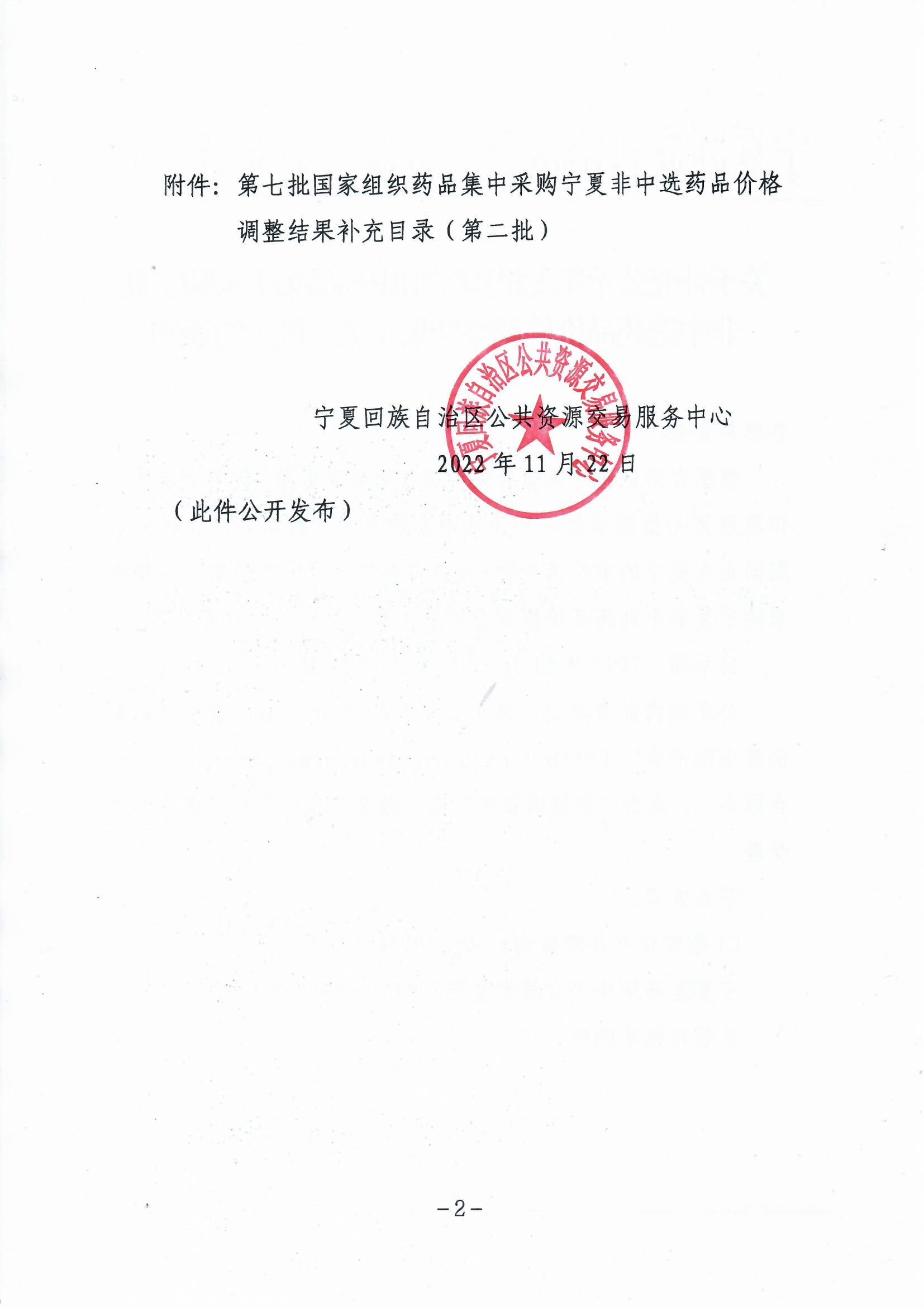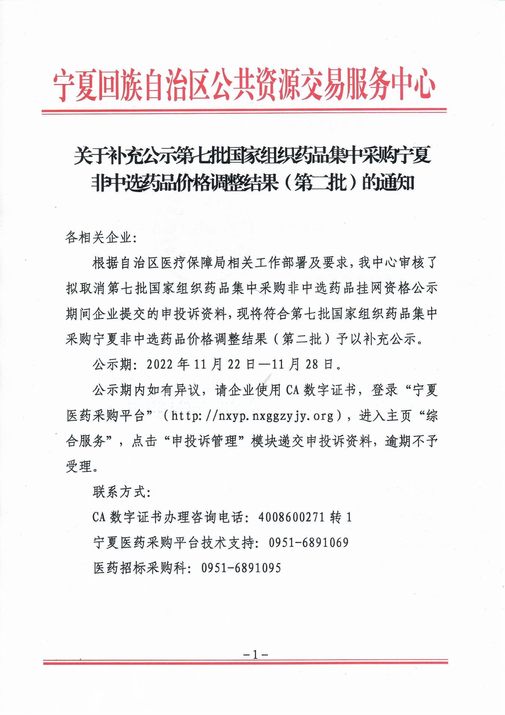 根据自治区医疗保障局相关工作部署及要求,我中心审核了拟取消第七批国家组织药品集中采购非中选药品挂网资格公示期间企业提交的申投诉资料,现将符合第七批国家组织药品集中采购宁夏非中选药品价格调整结果(第二批)予以补充公示。