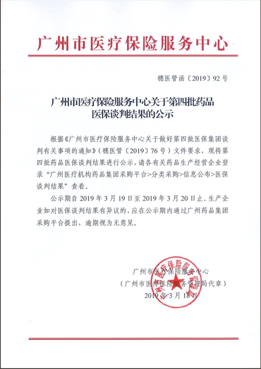 【广州】广东省广州市医疗保险服务中心关于第四批药品医保谈判结果的公示