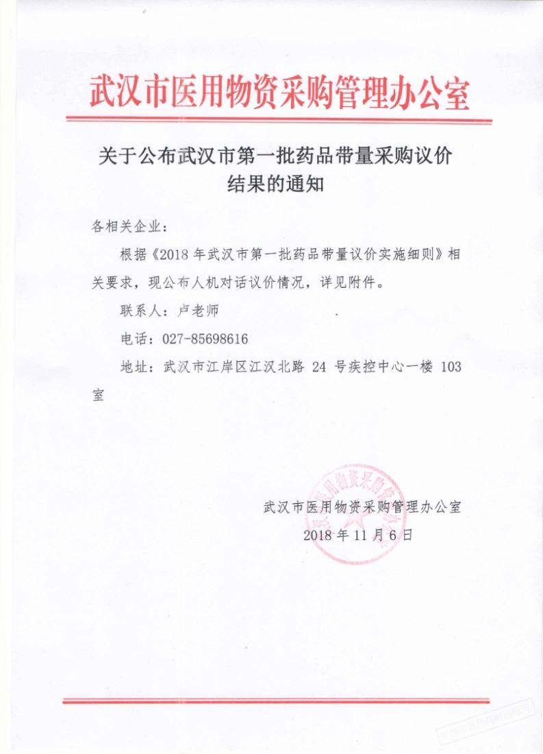 【武汉】关于公布武汉市第一批药品带量采购议价结果的通知