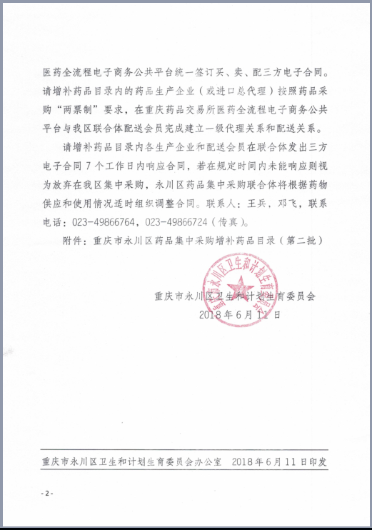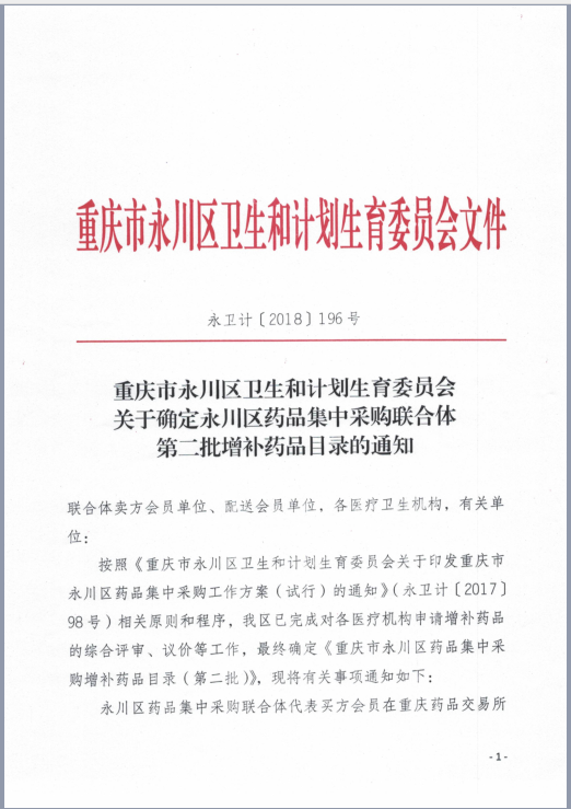 【永川区】重庆市永川区卫计委关于确定永川区药品集中采购联合体第二批增补药品目录的通知