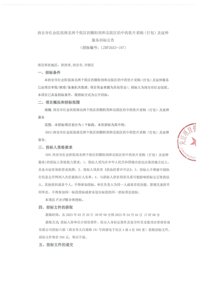 【西安市红会医院】陕西省〔西安市红会医院南北两个院区的颗粒剂和北院区的中药饮片采购(打包)及延伸服务〕招标公告